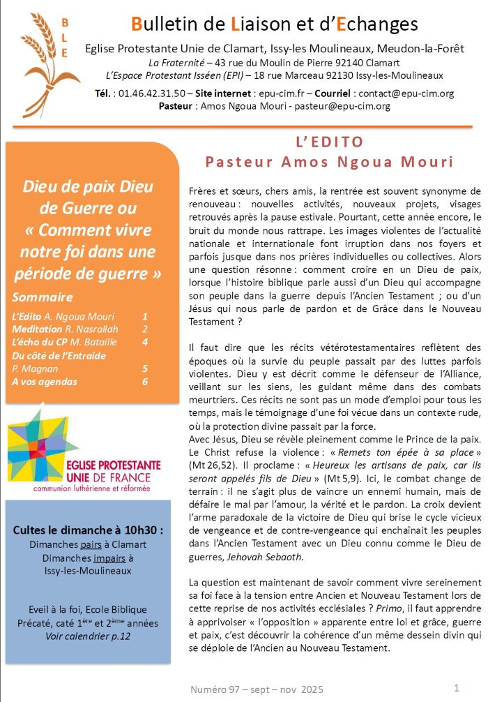 Blé septembre – novembre 2025 : « Dieu de paix Dieu de Guerre ou « Comment vivre notre foi dans une période de guerre » »